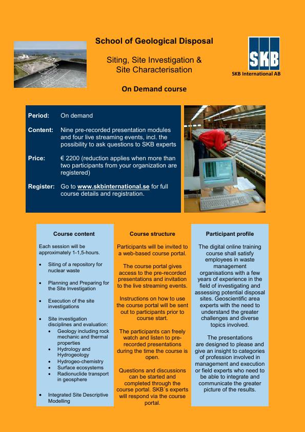 | Target group | The site investigation management of a waste disposal organisation, especially those for scientifically based investigations of the soil, bedrock and ground surface. Trainees are people already working in the field of radioactive waste disposal. |